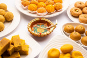 Popularne indyjskie słodkie danie znane jako Boondi laddu znajduje się na niebieskim tle.