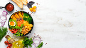 Zdjęcie "Makaron ryżowy z krewetkami, jajkiem i zielenią w czarnej płycie na czarnym kamiennym tle. Widok góry. Wolne miejsce na tekst." może być wykorzystywane do celów osobistych i komercyjnych zgodnie z warunkami zakupionej licencji Royalty-free. Obraz jest dostępny do pobrania w jakości wysokiej rozdzielczości do 5760x3840.