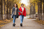 Dwie piękne dziewczyny odpoczywające na ławce w jesiennym parku