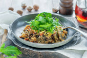 Grzyby, chorizo i tymianek risotto z sałatą rakietową