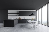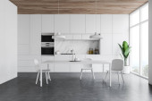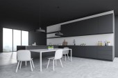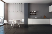 Zdjęcie "Szaro-biała kuchnia ze stołem jadalnym" może być wykorzystywane do celów osobistych i komercyjnych zgodnie z warunkami zakupionej licencji Royalty-free. Obraz jest dostępny do pobrania w jakości wysokiej rozdzielczości do 5760x3840.