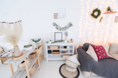 Zdjęcie "Piękny apartament typu studio w stylu skandynawskim, urządzone na Boże Narodzenie i Nowy Rok, kuchnia i stół z drzwiami wejściowymi" może być wykorzystywane do celów osobistych i komercyjnych zgodnie z warunkami zakupionej licencji Royalty-free. Obraz jest dostępny do pobrania w jakości wysokiej rozdzielczości do 5760x3840.