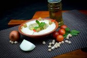 Zdjęcie "Płyta tradycyjnego wschodniego Hummusa. Arabskie tradycyjne jedzenie. Środkowo-wschodnia półmiska." może być wykorzystywane do celów osobistych i komercyjnych zgodnie z warunkami zakupionej licencji Royalty-free. Obraz jest dostępny do pobrania w jakości wysokiej rozdzielczości do 5760x3840.