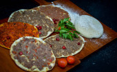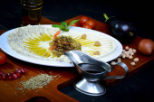 Płyta tradycyjnego wschodniego Hummusa. Arabskie tradycyjne jedzenie. Środkowo-wschodnia półmiska.