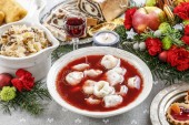 Świąteczna zupa grzybowa, tradycyjna wegetariańska zupa grzybowa wykonana z suszonych leśnych grzybów w ceramicznym talerzu na świątecznym stole. Polski świąteczny obiad