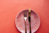 Eleganckie ustawienie stołu na pomarańczowym tle, płaski leżak. Miejsce na tekst