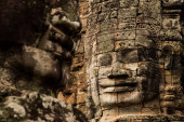 Malowniczy widok gigantycznych uśmiechniętych kamiennych twarzy świątyni Bayon