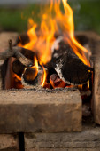 Ogień w starym kominku z cegły tak blisko, vintage stonowane