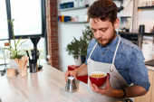 Zdjęcie "Umiejętny barman mierzy kawę za filiżankę latte" może być wykorzystywane do celów osobistych i komercyjnych zgodnie z warunkami zakupionej licencji Royalty-free. Obraz jest dostępny do pobrania w jakości wysokiej rozdzielczości do 5760x3840.