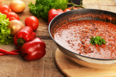 Zdjęcie "Sos marinara. Gotowany domowy sos pomidorowy do makaronu lub spaghetti na patelni z drewnianą łyżką. Świeża zielona pietruszka, pieprz chili i czosnek na desce. Zbliżenie" może być wykorzystywane do celów osobistych i komercyjnych zgodnie z warunkami zakupionej licencji Royalty-free. Obraz jest dostępny do pobrania w jakości wysokiej rozdzielczości do 5760x3840.