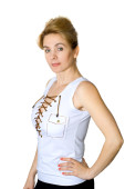 kobieta w jasny sportu z kapturem utrzymanie strony na biodrze