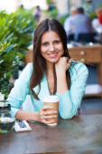 młoda kobieta siedząca w kawiarni, przy filiżance herbaty