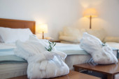 Zdjęcie "Składany szlafrok na łóżku w pokoju" może być wykorzystywane do celów osobistych i komercyjnych zgodnie z warunkami zakupionej licencji Royalty-free. Obraz jest dostępny do pobrania w jakości wysokiej rozdzielczości do 5760x3840.