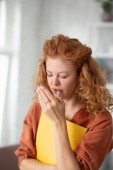 Młoda niebieskooka kobieta zażywająca pigułki podczas gorączki