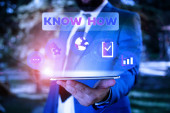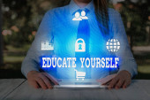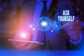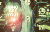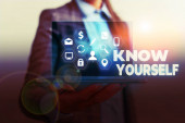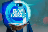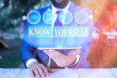 Pisanie pisma ręcznego Poznaj siebie. Pojęcie rozumieniu Znajdź Cię zrozumienie siły i słabości tożsamość mężczyzna nosić formalne kombinezon roboczy prezentacji za pomocą inteligentnego urządzenia.