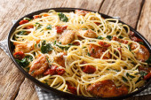 Włoski makaron z brokułami, kurczakiem, pomidorami i dynią blisko