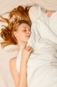 Kobieta śpiąca na białej poduszce i łóżku do odpoczynku w sypialni