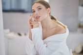 Piękna kobieta z idealnym uśmiechem patrząc na kamery w domu