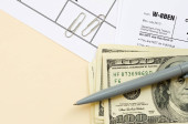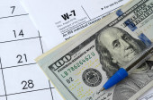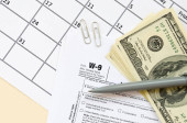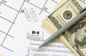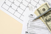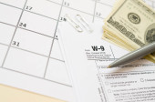 Formularz Irs W-9 Wniosek o numer identyfikacyjny podatnika i zaświadczenie puste leży z długopisem i banknotami o wartości wielu stu dolarów na stronie kalendarzowej