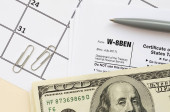 Formularz Irs W-8ben Świadectwo statusu zagranicznego właściciela odsetek dla Stanów Zjednoczonych podatku u źródła i raportowania dla osób fizycznych puste leży z długopisem i stu dolarów banknotów na stronie kalendarzowej