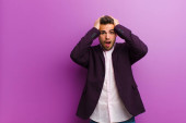 młody rudy biznesmen wygląda zmartwiony, niespokojny, zestresowany i przestraszony, obgryzając paznokcie i patrząc na boczną przestrzeń kopiowania na pomarańczowym tle