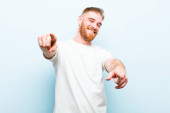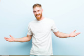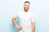 młody czerwony głowa człowiek patrząc szczęśliwy, wesoły i pewny siebie, uśmiechnięty dumnie i patrząc na bok z obu rąk na biodrach na miękkim niebieskim tle