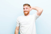 Zdjęcie "młody czerwony głowa człowiek patrząc szczęśliwy, wesoły i pewny siebie, uśmiechnięty dumnie i patrząc na bok z obu rąk na biodrach na miękkim niebieskim tle" może być wykorzystywane do celów osobistych i komercyjnych zgodnie z warunkami zakupionej licencji Royalty-free. Obraz jest dostępny do pobrania w jakości wysokiej rozdzielczości do 5760x3840.