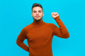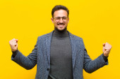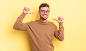 Zdjęcie "młody Hiszpan czuje się jak szczęśliwy i podekscytowany geniusz po zrealizowaniu pomysłu, radośnie wskazując palcem, eureka! przy pomarańczowej ścianie" może być wykorzystywane do celów osobistych i komercyjnych zgodnie z warunkami zakupionej licencji Royalty-free. Obraz jest dostępny do pobrania w jakości wysokiej rozdzielczości do 5760x3840.