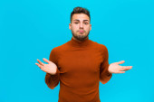 Zdjęcie "młody Hiszpan czuje się zakłopotany i zdezorientowany, wątpi, waży lub wybiera różne opcje z zabawnym wyrazem twarzy na niebieskim tle" może być wykorzystywane do celów osobistych i komercyjnych zgodnie z warunkami zakupionej licencji Royalty-free. Obraz jest dostępny do pobrania w jakości wysokiej rozdzielczości do 5760x3840.