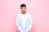 Zdjęcie "młody Hiszpan z zaskoczony, nerwowy, zmartwiony lub przerażony wygląd, patrząc z boku w kierunku miejsca kopiowania na niebieskim tle" może być wykorzystywane do celów osobistych i komercyjnych zgodnie z warunkami zakupionej licencji Royalty-free. Obraz jest dostępny do pobrania w jakości wysokiej rozdzielczości do 5760x3840.