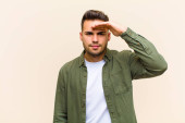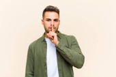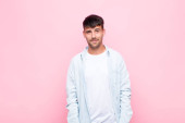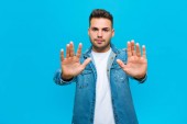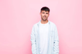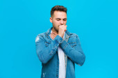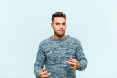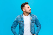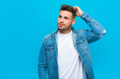młody Hiszpan z zaskoczony, nerwowy, zmartwiony lub przerażony wygląd, patrząc z boku w kierunku miejsca kopiowania na niebieskim tle