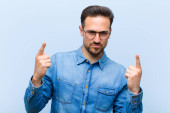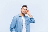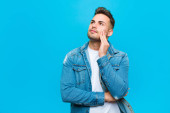 młody Hiszpan uśmiechający się szczęśliwie i patrzący w bok, zastanawiający się, myślący lub mający pomysł na niebieskie tło