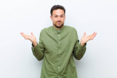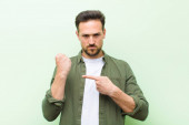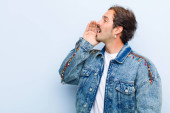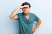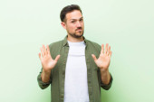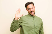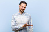 młody przystojny mężczyzna wygląda szczęśliwy, zdumiony i zaskoczony, uśmiechnięty i realizujący niesamowite i niesamowite dobre wieści