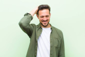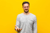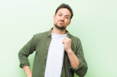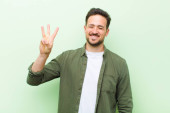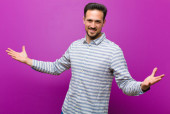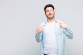 Zdjęcie "młody przystojny mężczyzna uśmiecha się pozytywnie i pewnie, wyglądając na zadowolonego, przyjaznego i szczęśliwego" może być wykorzystywane do celów osobistych i komercyjnych zgodnie z warunkami zakupionej licencji Royalty-free. Obraz jest dostępny do pobrania w jakości wysokiej rozdzielczości do 5760x3840.