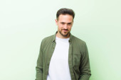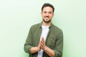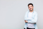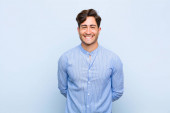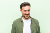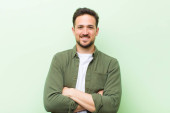 młody przystojny mężczyzna uśmiecha się pozytywnie i pewnie, wyglądając na zadowolonego, przyjaznego i szczęśliwego