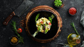 Zdjęcie "Makaron z dynią i szpinakiem w czarnej płycie na czarnym tle. Widok góry. Wolne miejsce na tekst." może być wykorzystywane do celów osobistych i komercyjnych zgodnie z warunkami zakupionej licencji Royalty-free. Obraz jest dostępny do pobrania w jakości wysokiej rozdzielczości do 5760x3840.