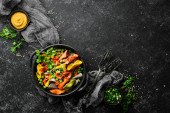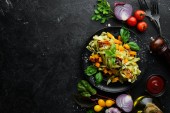 Makaron z dynią i szpinakiem w czarnej płycie na czarnym tle. Widok góry. Wolne miejsce na tekst.