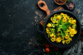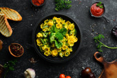 Zdjęcie "Makaron z dynią i szpinakiem w czarnej płycie na czarnym tle. Widok góry. Wolne miejsce na tekst." może być wykorzystywane do celów osobistych i komercyjnych zgodnie z warunkami zakupionej licencji Royalty-free. Obraz jest dostępny do pobrania w jakości wysokiej rozdzielczości do 5760x3840.