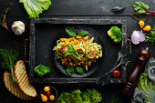 Makaron z dynią i szpinakiem w czarnej płycie na czarnym tle. Widok góry. Wolne miejsce na tekst.