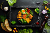 Zdjęcie "Makaron z dynią i szpinakiem w czarnej płycie na czarnym tle. Widok góry. Wolne miejsce na tekst." może być wykorzystywane do celów osobistych i komercyjnych zgodnie z warunkami zakupionej licencji Royalty-free. Obraz jest dostępny do pobrania w jakości wysokiej rozdzielczości do 5760x3840.