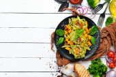 Zdjęcie "Miska Buddy: dynia, brokuły, jajko, pomidory, marchewka, papryka w czarnej talerzu na białym drewnianym tle. Widok góry. Wolne miejsce na tekst." może być wykorzystywane do celów osobistych i komercyjnych zgodnie z warunkami zakupionej licencji Royalty-free. Obraz jest dostępny do pobrania w jakości wysokiej rozdzielczości do 5760x3840.