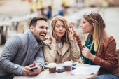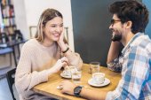 Pięknej miłości para siedząc w kawiarni korzystających w kawie i