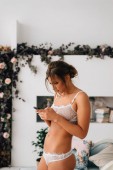 Sexy rudowłosa modelka z jasnym makijażem w modnej krótkiej sukience pozowanie we wnętrzu Bożego Narodzenia. Młoda kobieta z szczupłym, idealnym ciałem we wnętrzu urządzonym na Nowy Rok. Koncepcja Wigilii