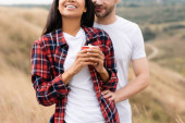 przycięty widok młodej pary trzymającej termo filiżanki siedząc na jesiennych liściach