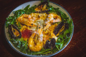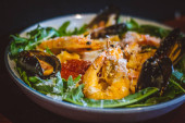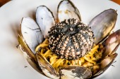 makaron z krewetkami w sosie, kawior łososiowy, kawior z rybą czarną, małże niebieskie, kalmary, olej truflowy, sos Tom Yum