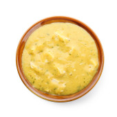 Mała szklana miska przypraw z żółtym sosem curry. Odizolowane w p
