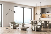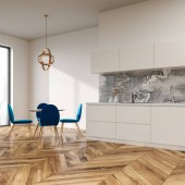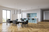 Zdjęcie "Drewniane podłogi kuchnia wnętrze ze stołem" może być wykorzystywane do celów osobistych i komercyjnych zgodnie z warunkami zakupionej licencji Royalty-free. Obraz jest dostępny do pobrania w jakości wysokiej rozdzielczości do 5760x3840.
