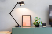 wnętrze nowoczesnego salonu z brązową sofą i czystym malowaniem, elegancki retro design z brązową sofą