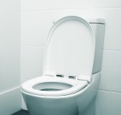 Biała wisząca Sedes w hotelowej łazience z białymi płytkami i papierem toaletowym na ścianie. Luksusowe wnętrze łazienki