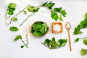 Widok z góry zielone limonki z cierniem na gałęzi na białym backgro